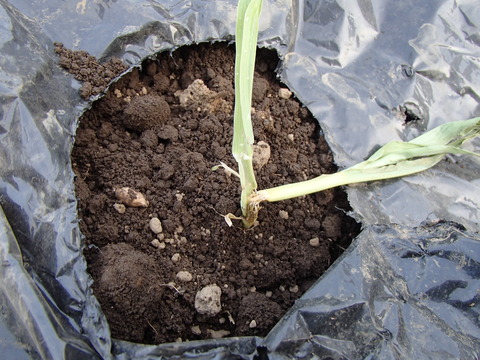 こここれが、噂のネキリムシでしょうか・・・(((( ;゚д゚)))マルチに植えているトウモロコシの苗が、根元の茎のあたりからポキンと折れています。。゚(゚´Д`゚)゜。ウァァァン私が、折った覚えはないし、一週間前の写真では、ちゃんと立っていました。。。今日、農場に行ったら折れていました。。。
