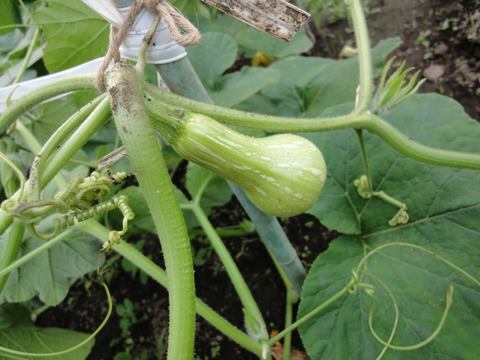 カボチャ(バターナッツ)の実ができはじめました。ひょうたんみたいな形で可愛いですよ~(・∀・)つ可愛いから、味も美味しいといいなぁ。(´・ω・`)