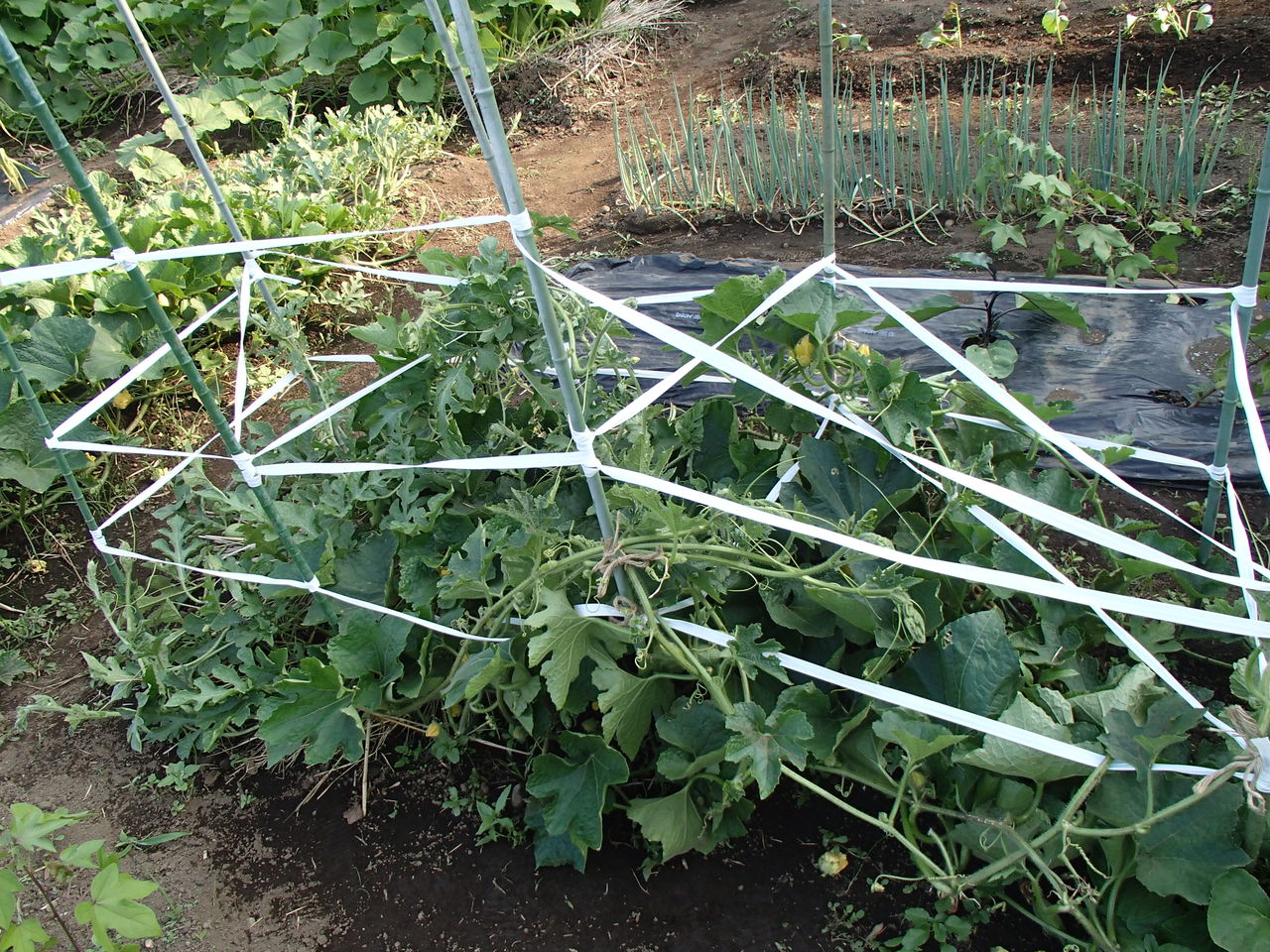 まず、冬瓜とスイカが大きくなってしまったので(実ではありません)、空中栽培に変更しました。
