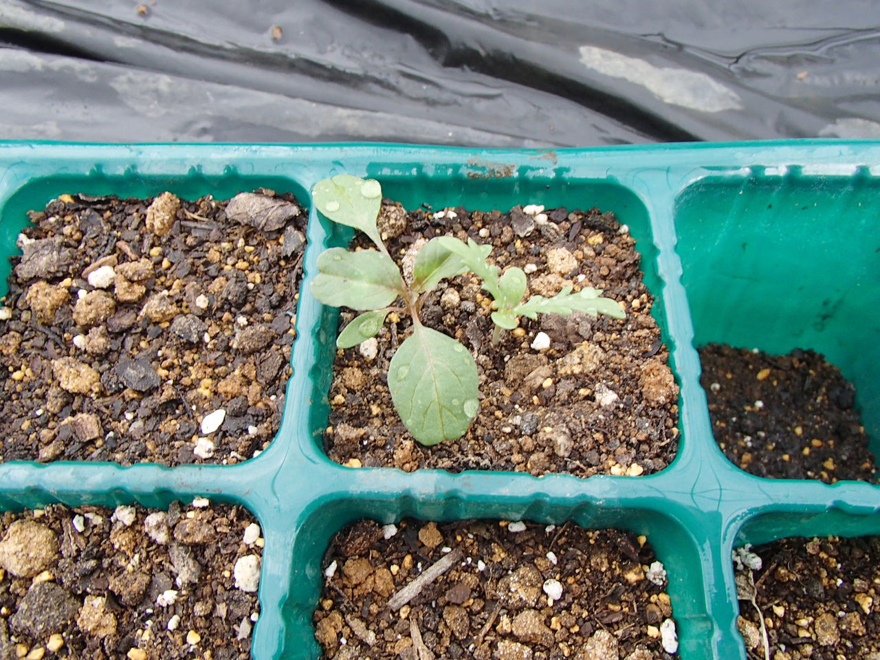 このセルですが、右の小さいのは、春菊でしょうか?それっぽい芽が出ていました。でも、雑草かもしれません。。。汗
