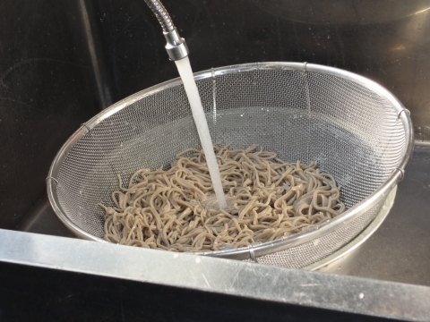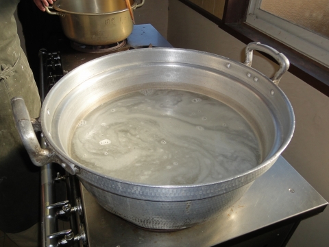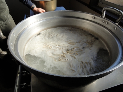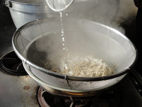 ”デカい”鍋に、ぐらぐらと沸騰させて、そばをちょこっと入れて、熱湯の対流で、ほぐしながらゆでるのがポイントです。