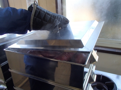 今回は、時間節減のため、ガスで蒸かしましたが、本当は、薪で3時間くらいかけて蒸かした方が美味しいそうです。ガスは、1時間位でふきあがります。