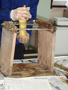 その後は、次の写真のようなど道具で、スライスします。このときに、あまり熱い状態でスライスするとグチャッとなってしまい上手くできないのです。ちょっと冷めたとき位にスライスすると上手く行きますよ。もちろん、包丁でスライスしてOKです。