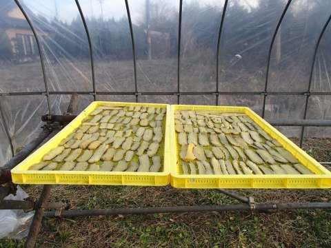 後は、このような乾かす為の網に乗せて、ビニールハウス(パイプハウス)の中で、5~7日乾かします。