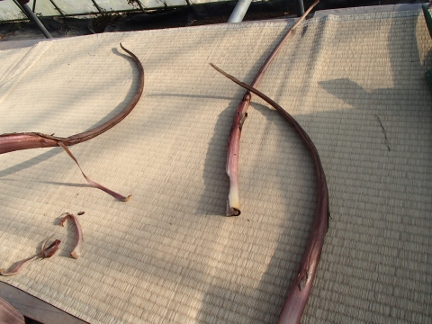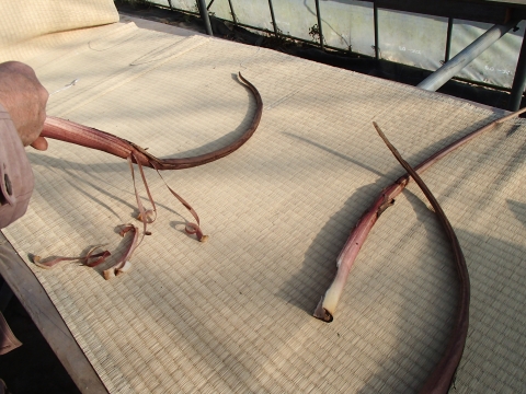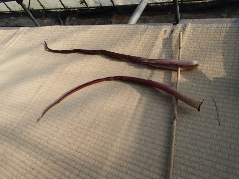 それから、こんな風に棒に刺して、乾かします。