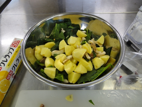 ジャガイモ、ホウレンソウ、生椎茸を切ります。