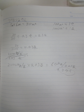 堆肥(牛糞堆肥)は、だいたい10a辺り、2tぐらい入れると良く、しんしん農園は、0.3aなのでこのように計算しました。