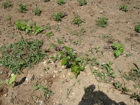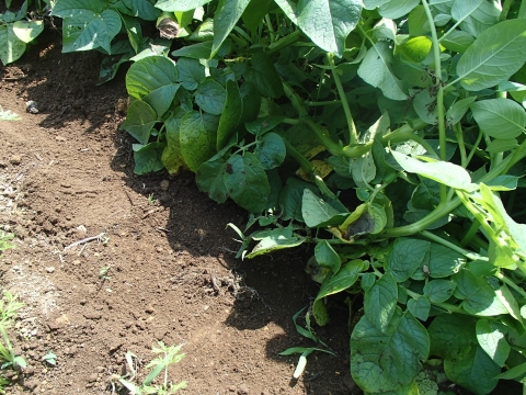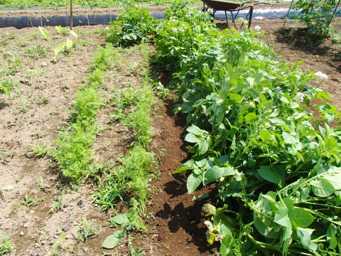 ジャガイモを除草も兼ねて、土寄せしました。ジャガイモは、土寄せをしないと、イモが土から出てしまい、イモが緑色になってしまいます。ジャガイモは、緑色になるとソラニンと言う毒物質がでて、食べられなくなってしまいますね。緑色のジャガイモ食べている方いないですよね?!毒です。