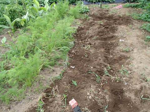 山のように置いてあった雑草をジャガイモを掘った穴に埋めて、草堆肥としました。
