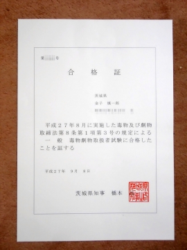 絶対落ちていたと思っていた、毒物劇物取扱責任者の試験に合格しました!ъ(゚Д゚)グッジョブ!!