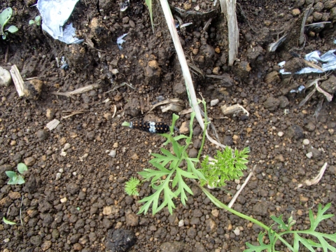 ニンジンにいつもの、キアゲハの幼虫の小さいのがついていました。ナウシカの王蟲みたいなのですね。