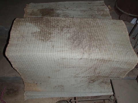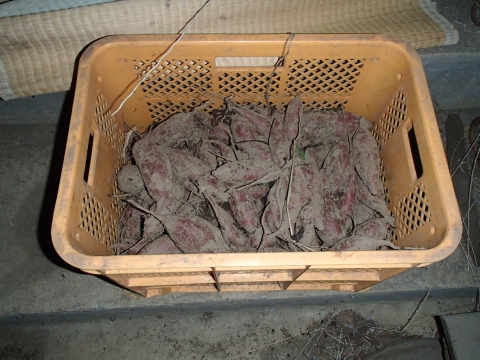 サツマイモは、霜に当てると腐ってしまうので、霜の当たらない屋根の下で、ゴザをかけて、若干温かくして、保存しています。