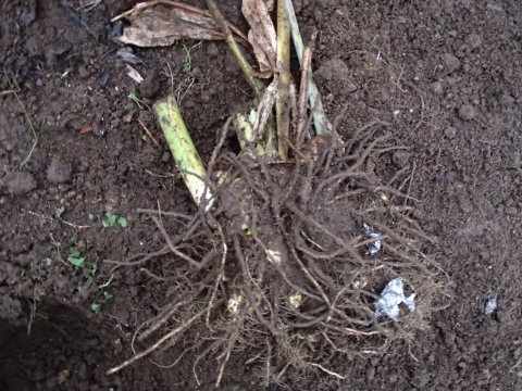 写真では、根っこばかりで分かりにくいかもしれませんが、しっかりとウコンのイモが出来ていますよ。