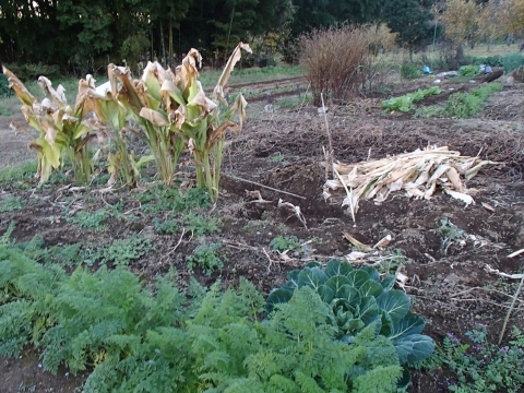 ウコンが少しだけ残っていましたが、これも、この日に全部採ってしまいました。真ん中あたりには、芽キャベツがあります!手前のニンジンが生き生きして、美味しそうですねヽ(⌒(ノ゚∀゚)ノこれも、私の胃袋の中に行くのでしょう(ΦдΦ)