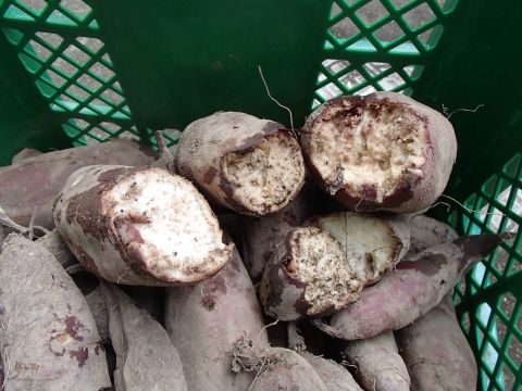 収穫したサツマイモを蔵の下に置いて、ゴザをかけておいたのですが、この日見てみたら、ほとんど腐っていました。。。_| ̄|○