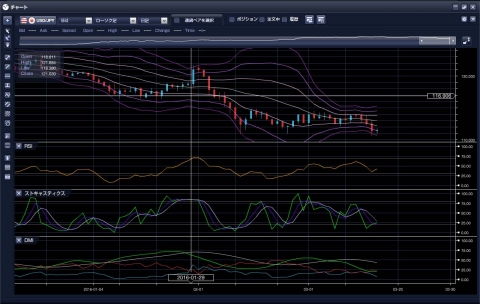 でも、最終的には、ボリンジャーバンド(偏差を使った指標)が、拡散して、下に向かって、先週の金曜日は引けました。