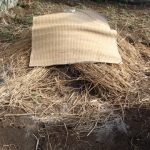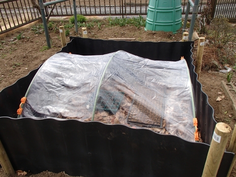 落ち葉と米ぬかをサンドウィッチにして踏み固めた後で、露地だとトンネルを掛けたりしないと、発酵が始まらないようです。