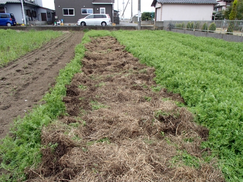 畑は、全面、ヘアリーベッチに覆われておりその上に播きました。