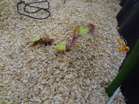 出てきた芽は、恐らく、紅はるかの様ですよ~もっと芽が出て、サツマイモさんがんばれ ( ^o^)ノー