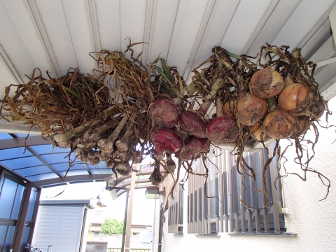 その他にも、ニンニク、タマネギの干し場を作りました。これで、ニンニク、タマネギもしばらくは、食べられそうですよ(^o^)ノ