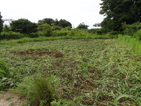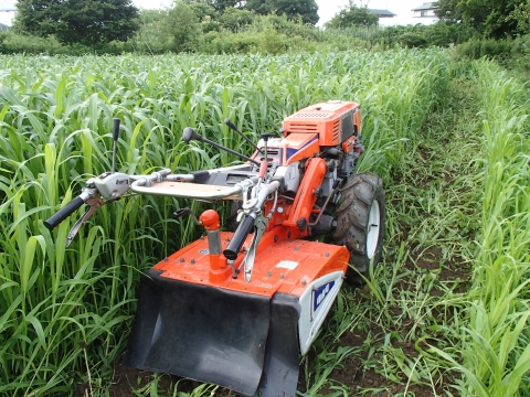 以前播いた緑肥、ソルゴーがかなり大きくなったので、刈り込みが始まりました。