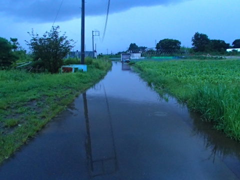これは、しんしん農園に至る道ですが、道が完全に冠水してしまい、水の中を4WD軽トラックで走りましたよ。。。(´;д;`)