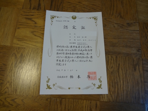 以前、ブログで書いた、エコファーマーの申請ですが、無事、取得することが出来ました。