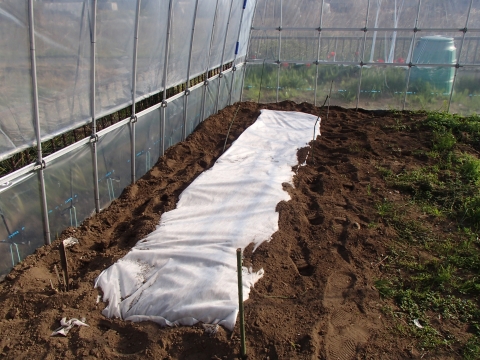 サツマイモの苗床は、パオパオ不織布で、暖かくしています。